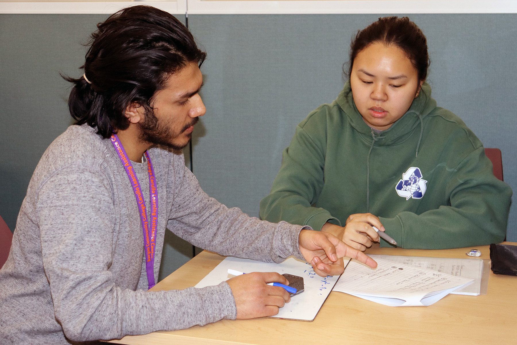 Bergen Community College professional tutor and alumnus Samir Parajuli works with current student Ashley Aizaga. PARAMUS, N.J. – The Association